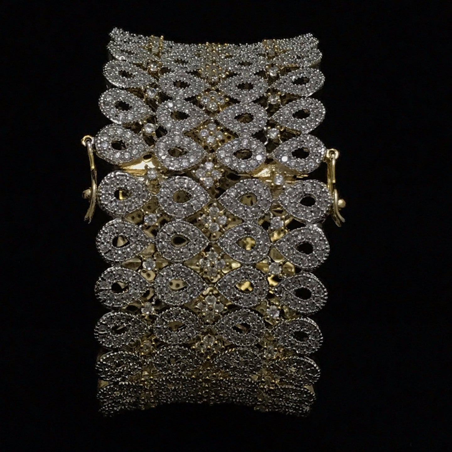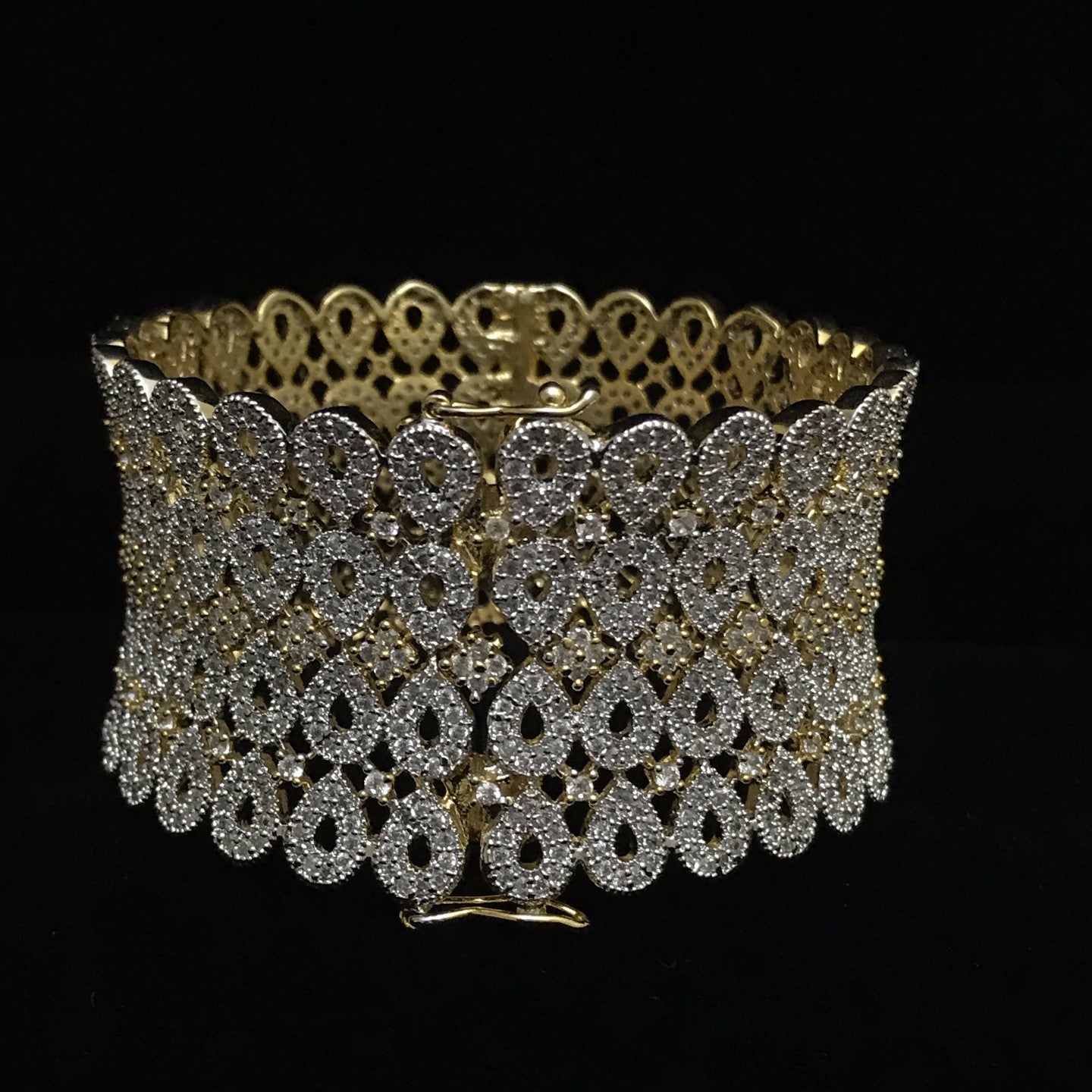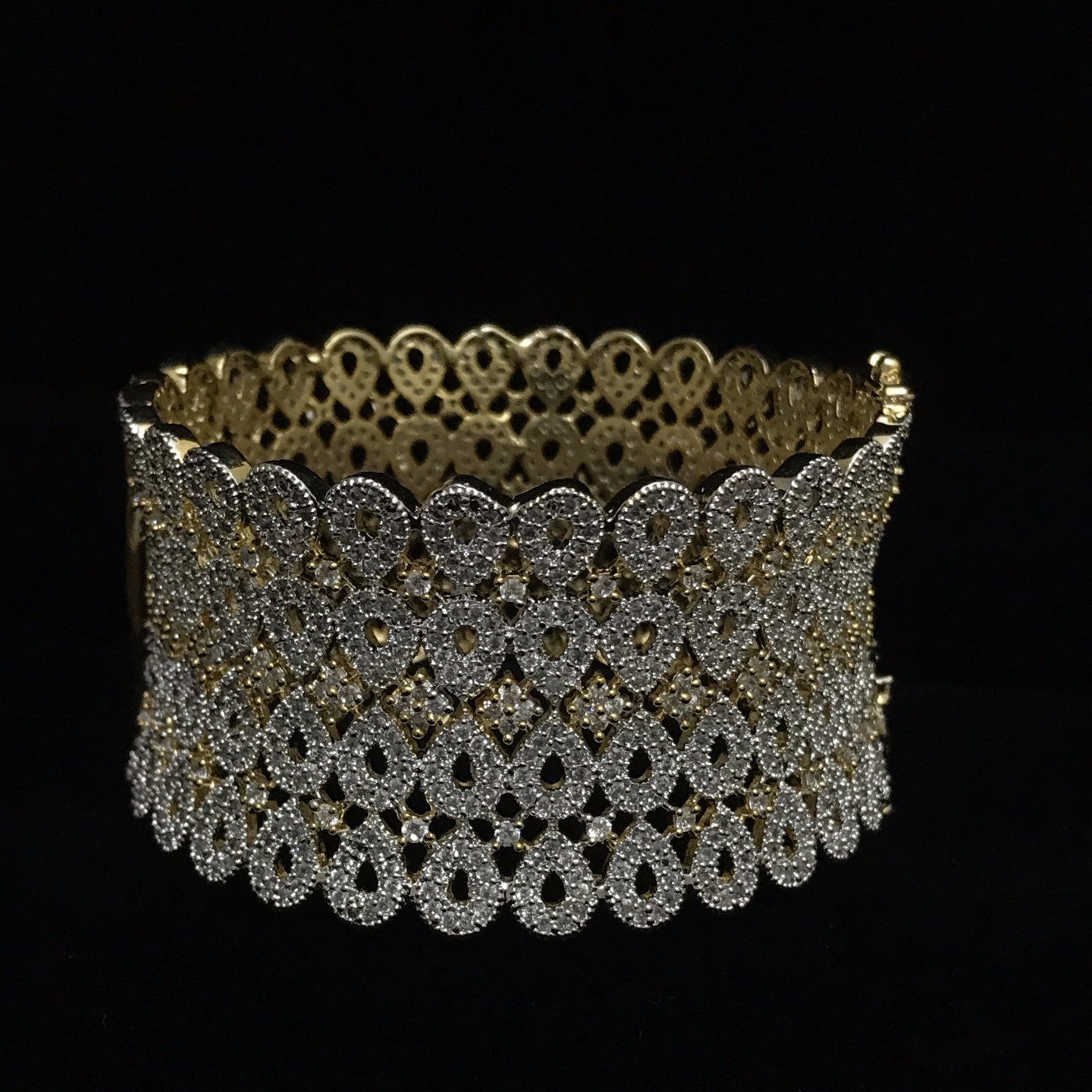 Elegant gold and rhodium plated cuff beautifully designed with round shaped simulated diamonds.