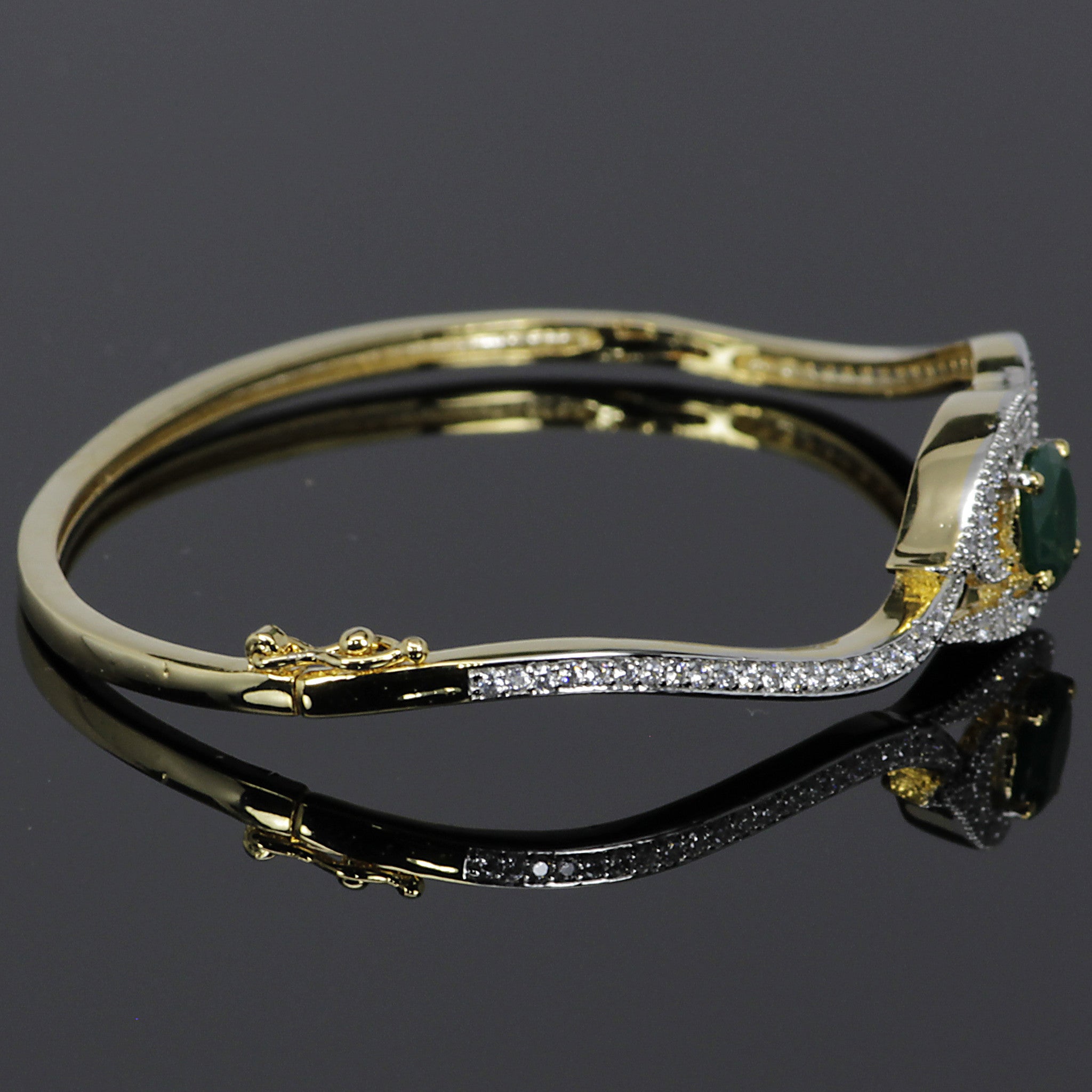 Sleek and classy, this bracelet features lines of simulated diamonds cocooning enchanting semi precious Emerald at its core. Glistening with rhodium plating, this elegant bracelet adds glamour to any look.