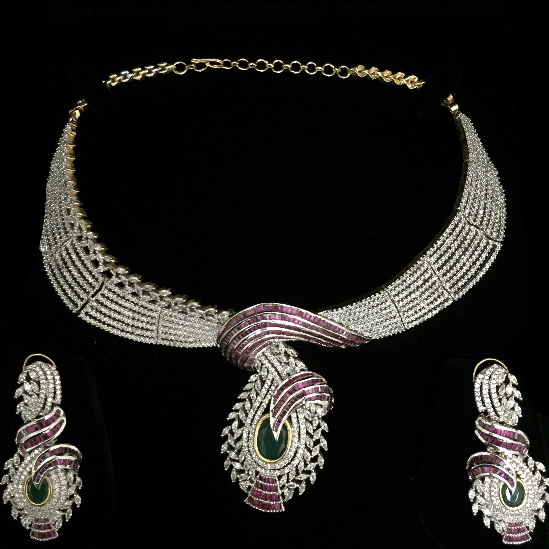 Simulated diamonds necklace set intricately designed by KCARAT experts, reflecting the beauty of gemstones. A sweep of ruby gemstones add a colorful contrast to this unique design. A lovely look for all special occasions, complemented by stunning earrings that secure with ring clasp at the back.