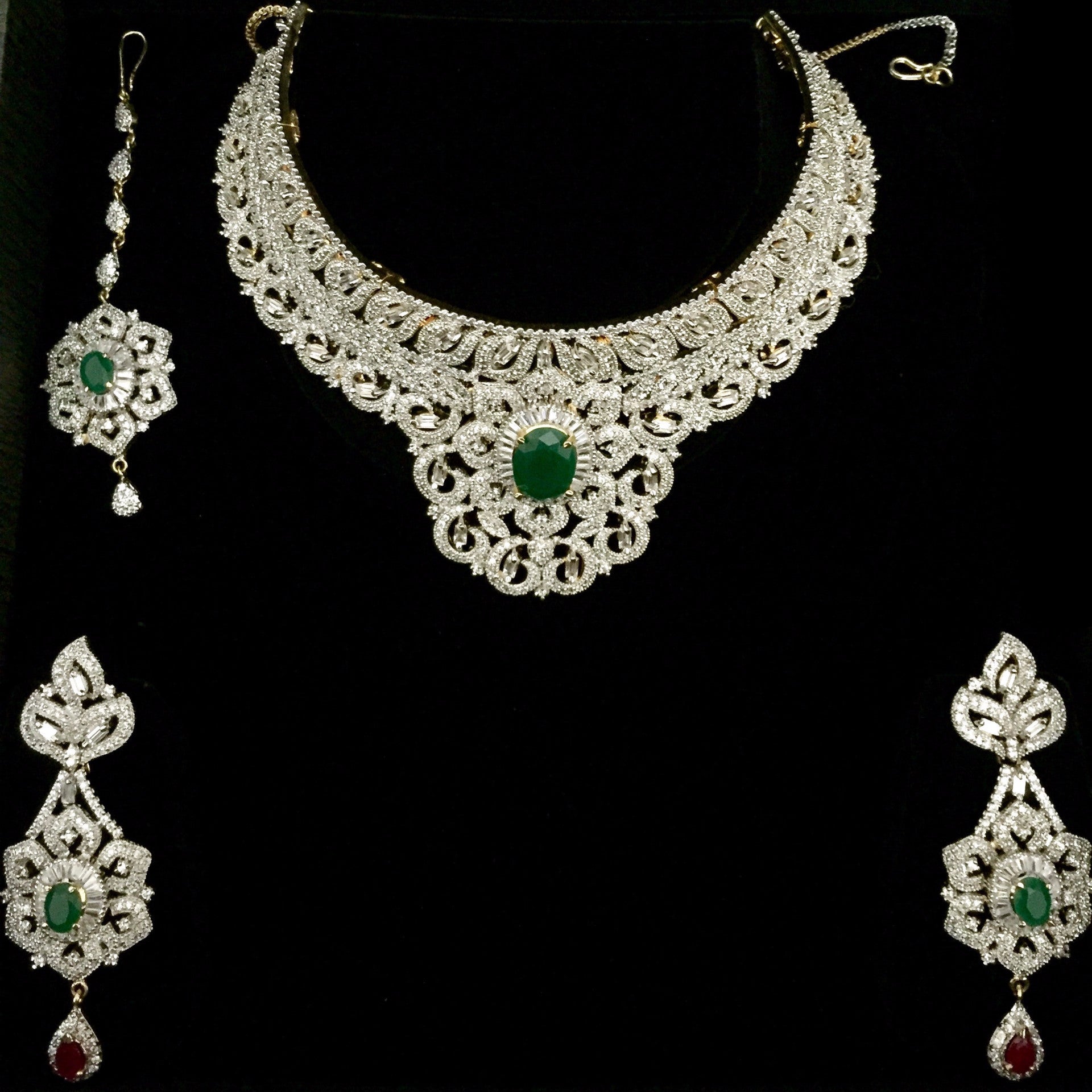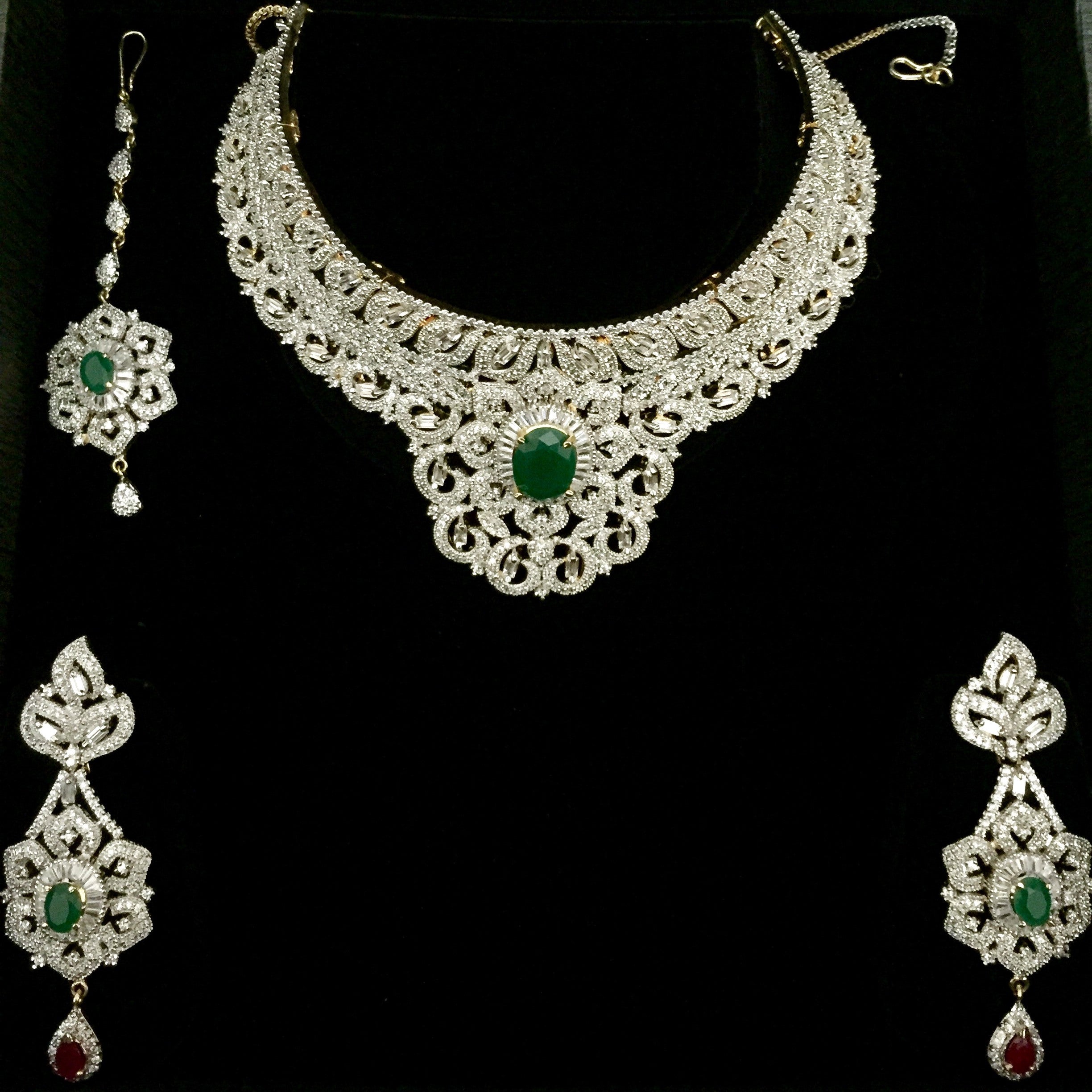 Captivating necklace set features sparkling american diamonds forming swirls. A flower motif in the center holds emerald in its heart outlined by halo of baguettes. Stunning earrings and head piece further enhances its beauty.