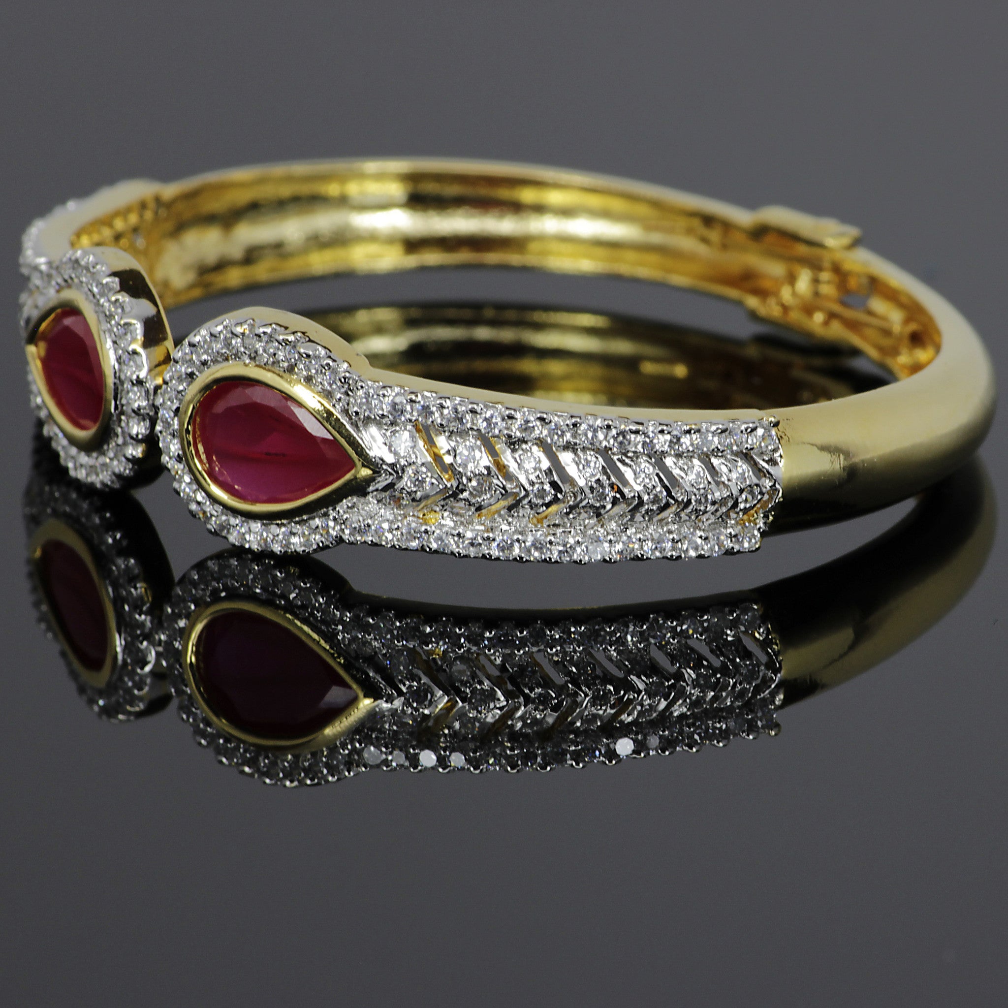 A frame of glittering simulated diamond accents surround the semi precious stones. Intricate chevron pattern on band adds beauty to the bracelet. This bracelet with gold and rhodium plating offers fabulous option with interchangeable gemstones.