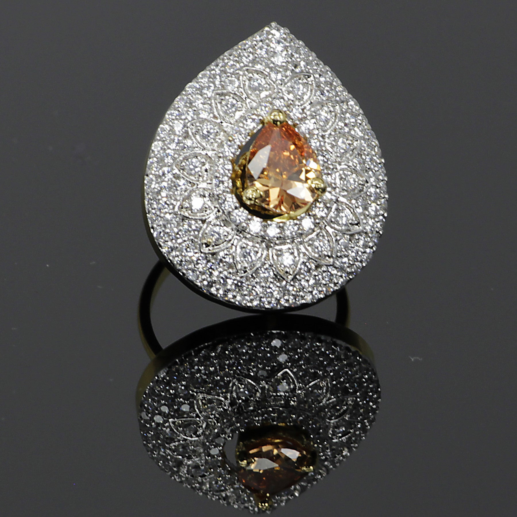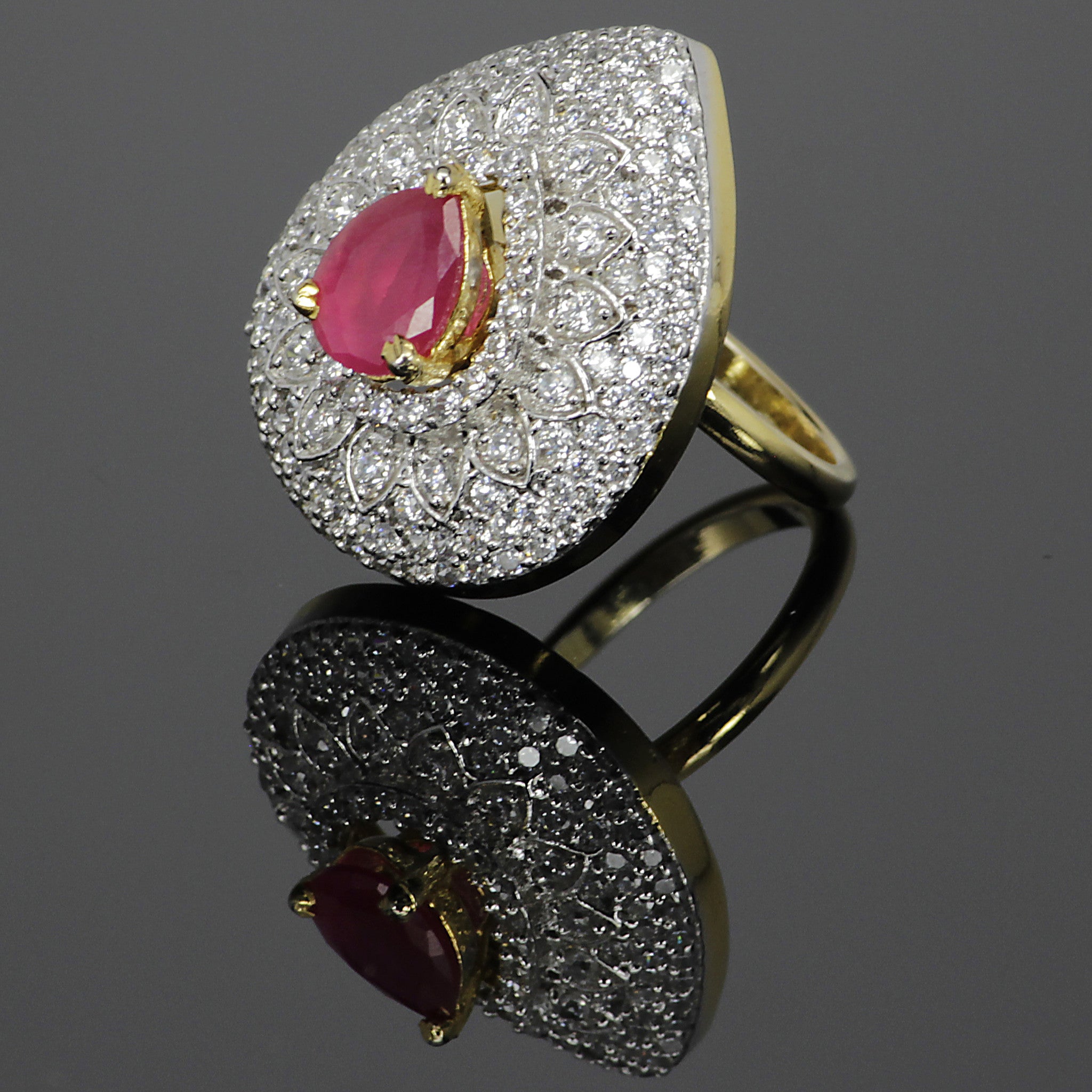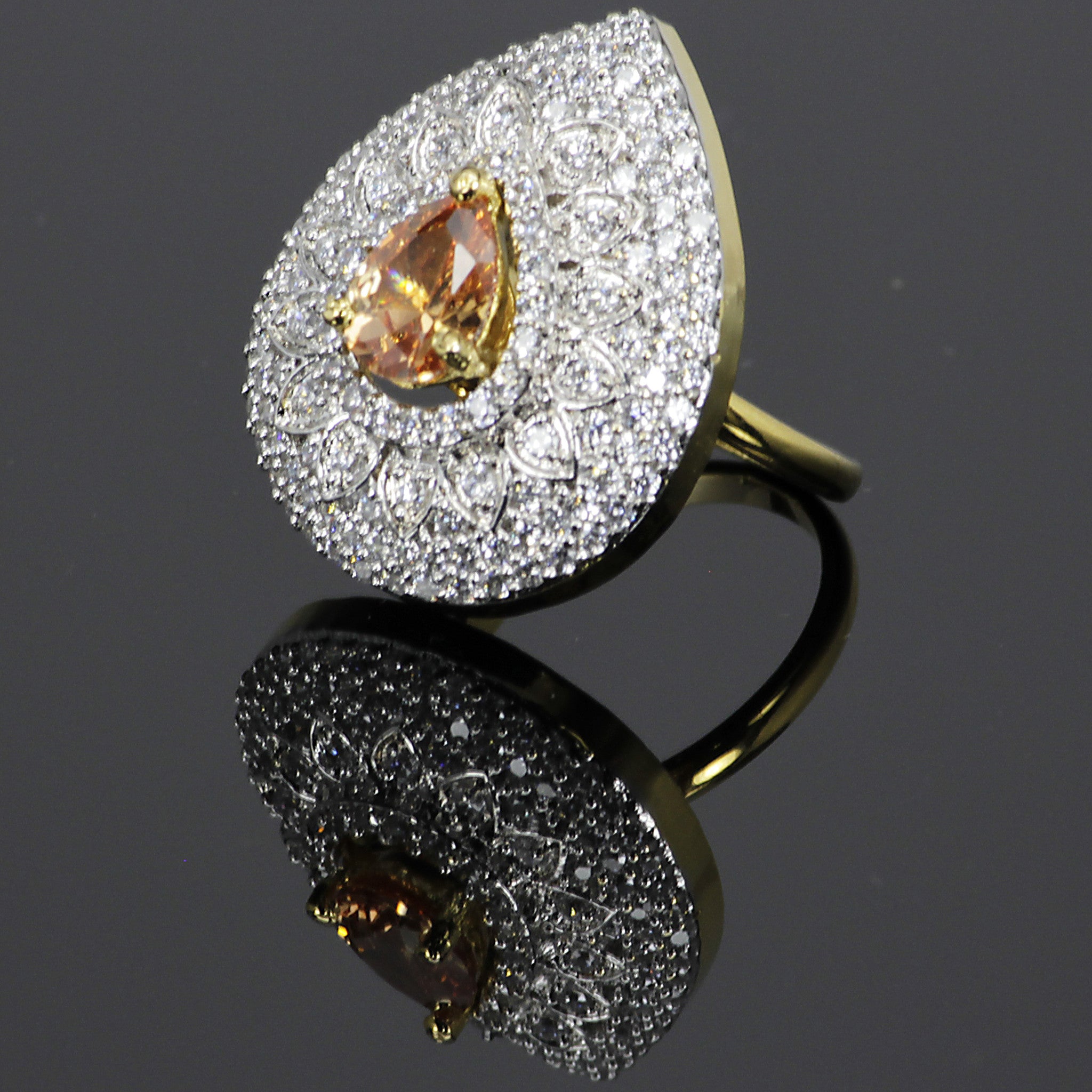 Meticulously crafted with rhodium plating, this ring showcases a brilliant pear shaped semi precious gemstone surrounded by  layers of simulated diamonds in a dazzling pattern. The regal style is designed to delight you with interchangeable gemstones in different colors.