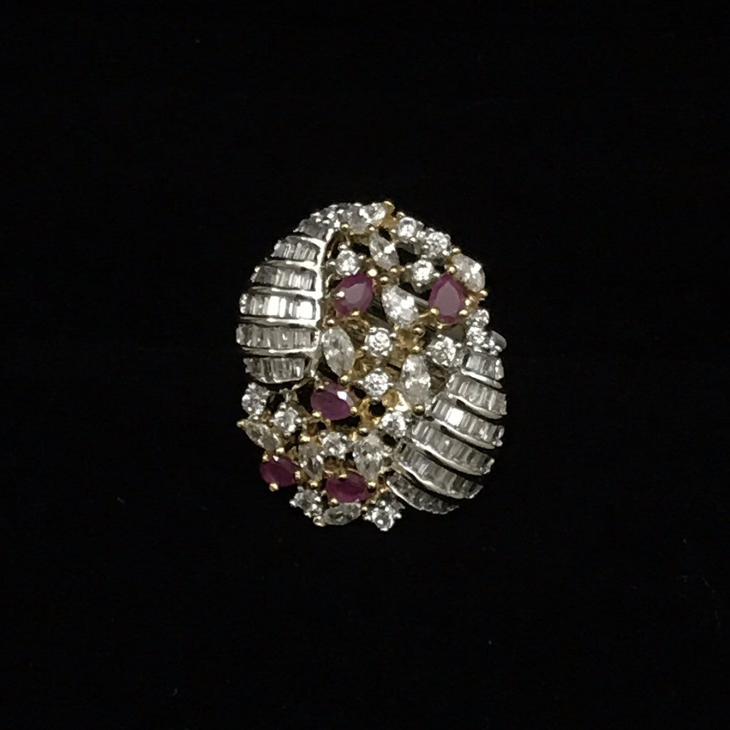 This charismatic ring features Gem stones along with simulated round diamonds adorned with baguettes.