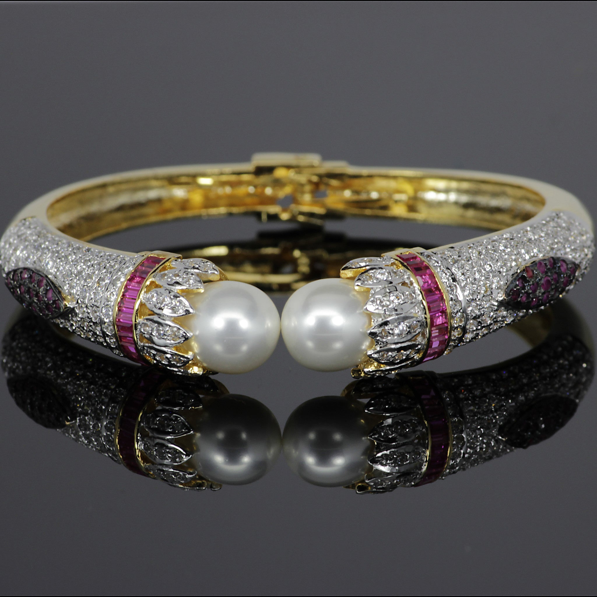 An extraordinary symmetrical bracelet follows the contours of fancy colored gemstones with pearls on top chosen by KCARAT experts.