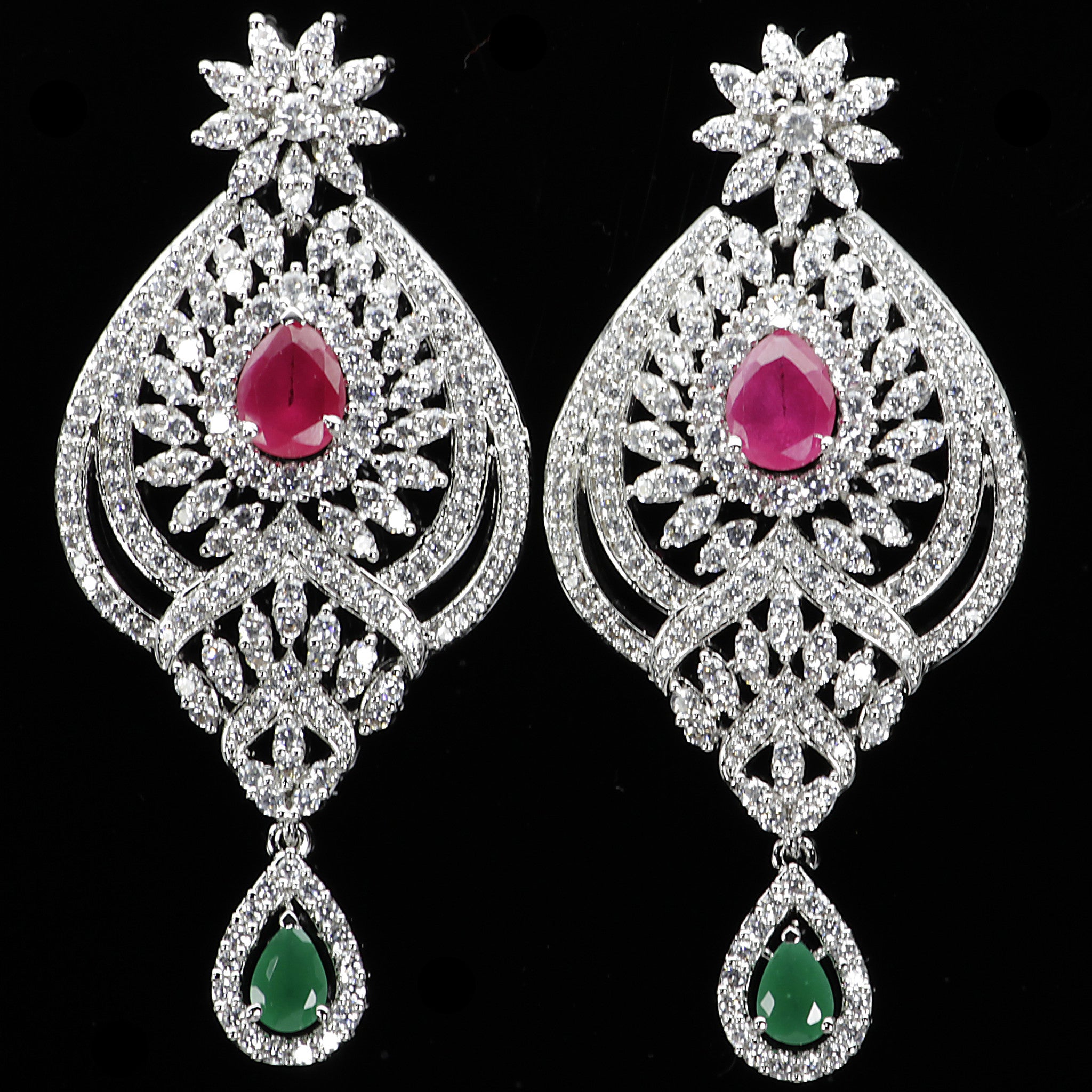 These scintillating earrings feature sparkling round shaped simulated diamonds with a semi precious Ruby at its core. Framed Emerald drop completes the look making these perfect for special occasions.