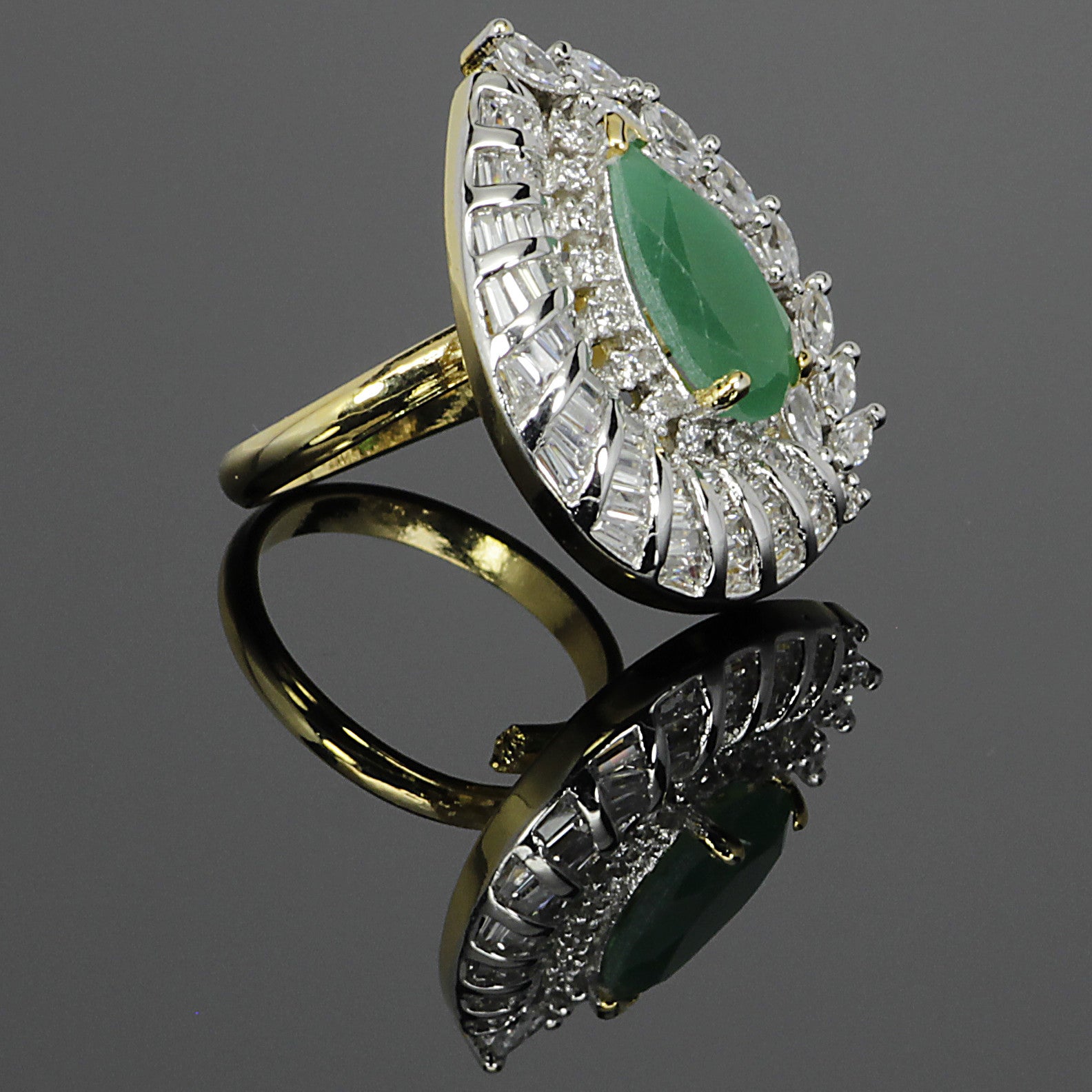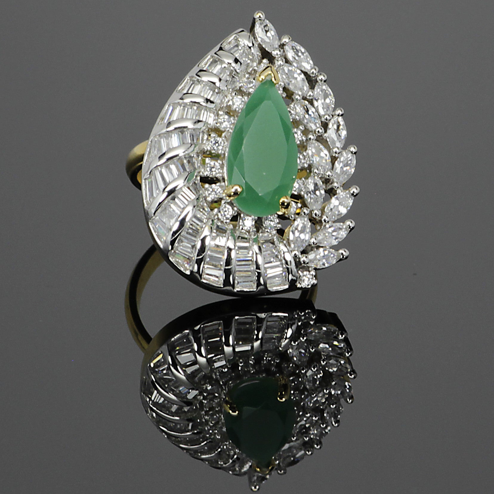 This cocktail ring features bezel set pear shaped gemstone outlined  by marquise on one side and baguettes on the other with accent simulated diamonds in the middle.