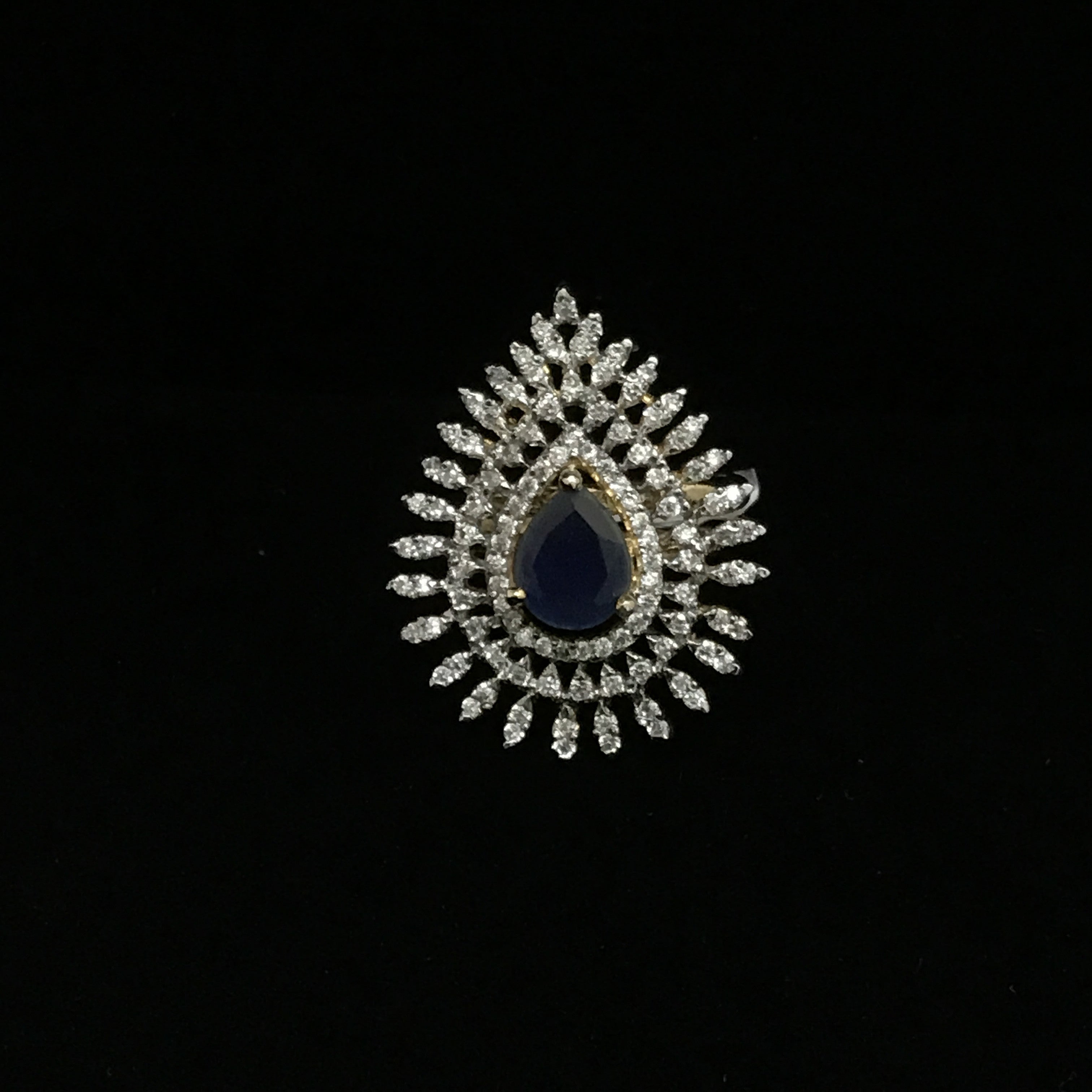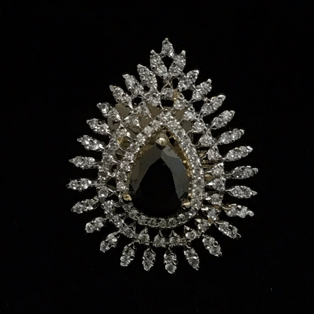 This cocktail ring features bezel set pear shaped gemstone outlined  by accent simulated diamonds. The ring is designed to mesmerize!