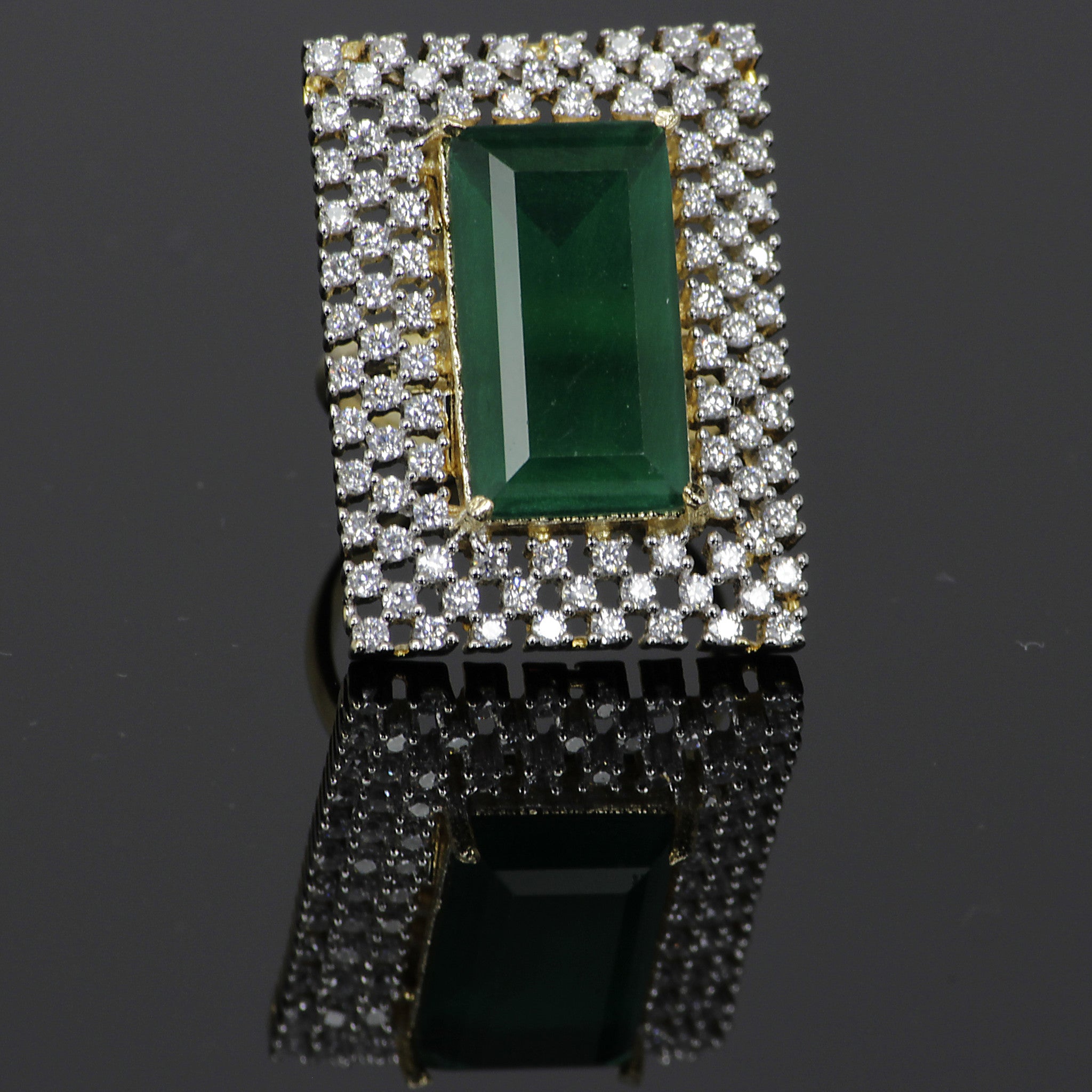 This expertly crafted ring features a semi precious Emerald gemstone at the center adorned by round shaped simulated diamonds.