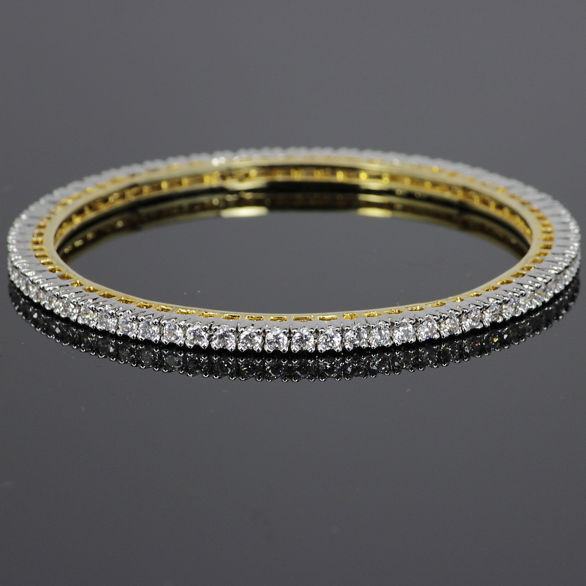 Crafted with a blend of gold and rhodium plating offers a contemporary and playful look. This bangle features  simulated diamond solitaires in a thread pave setting which can look lovely alone or stacked up.